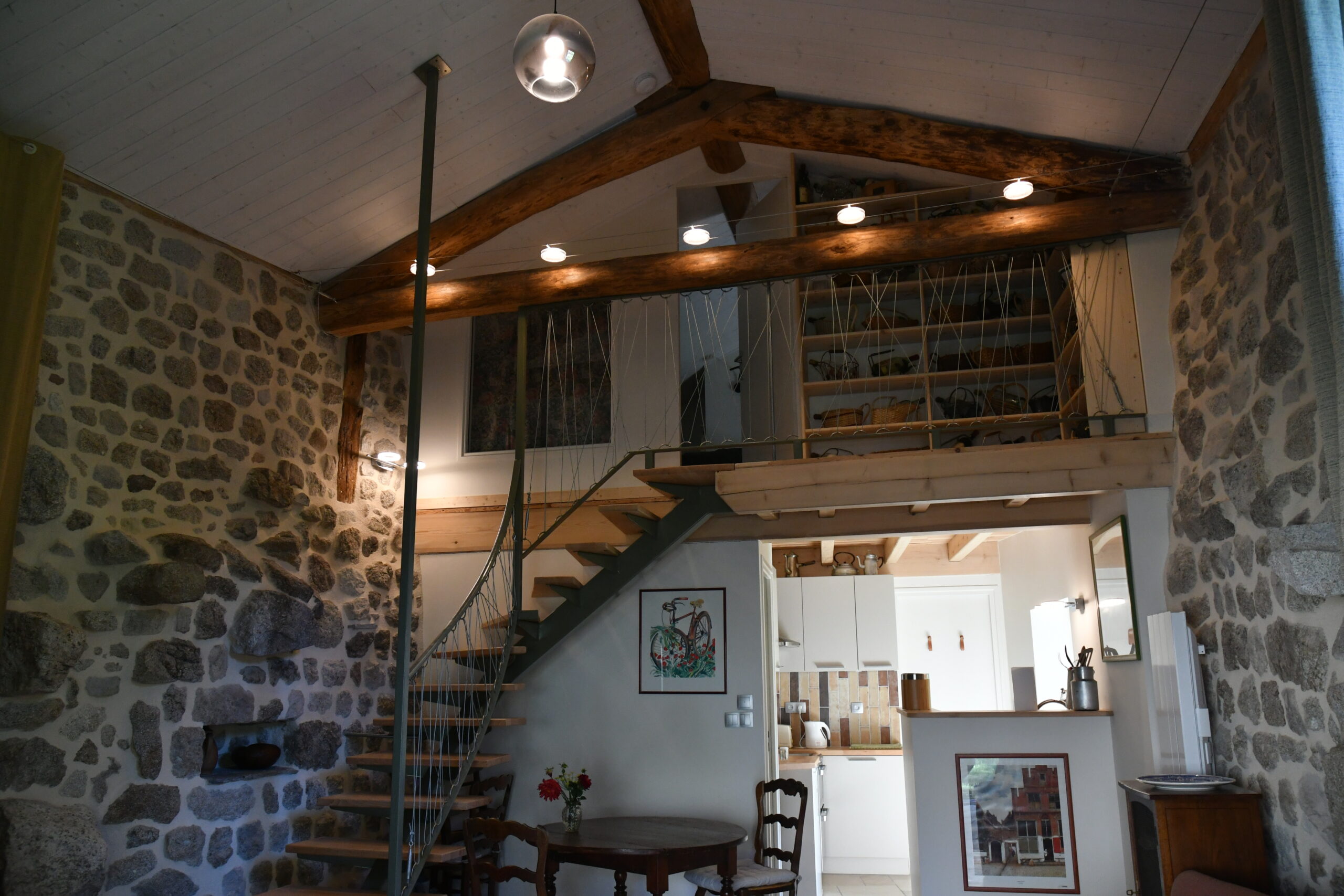 Une table d’hôtes en Haute-Loire, au cœur de l’Auvergne, aménagée dans une ancienne bâtisse respectueuse de son authenticité, avec ses pierres apparentes d’origine. La décoration mêle meubles et objets chinés auprès d’habitants locaux, créant une atmosphère chaleureuse où modernité et tradition se rencontrent harmonieusement.